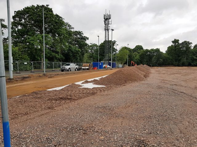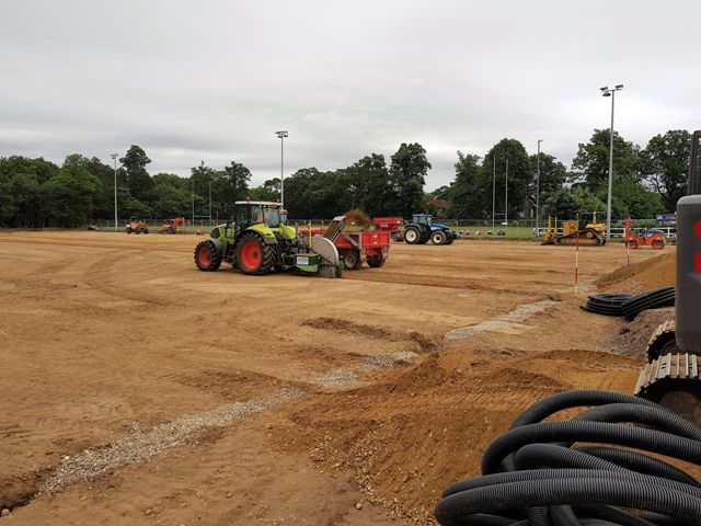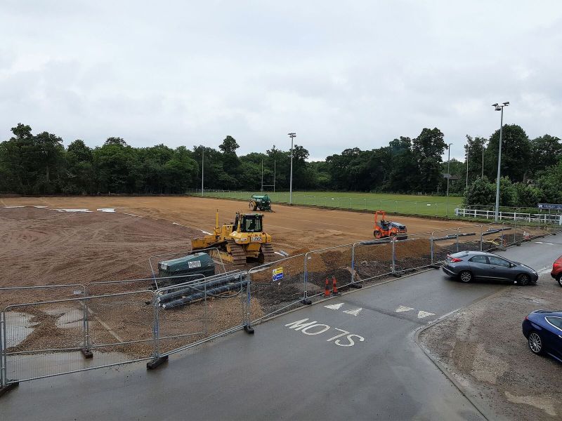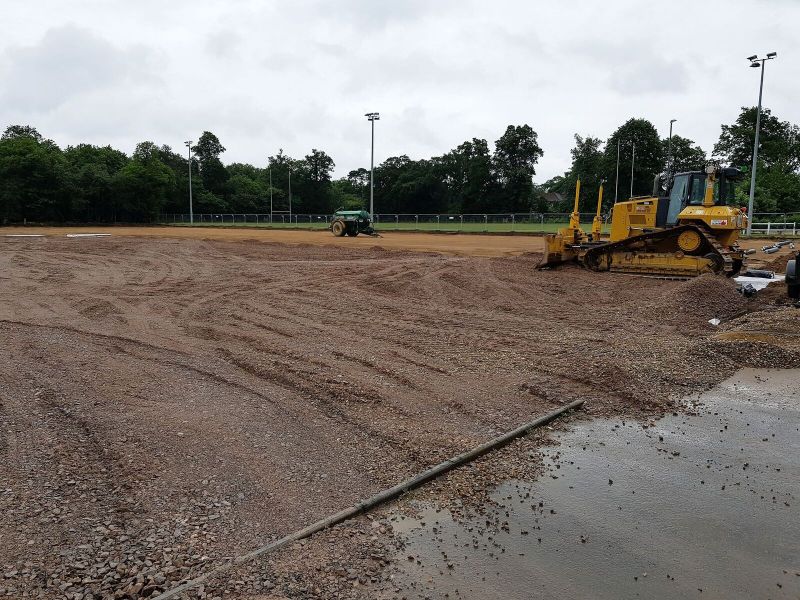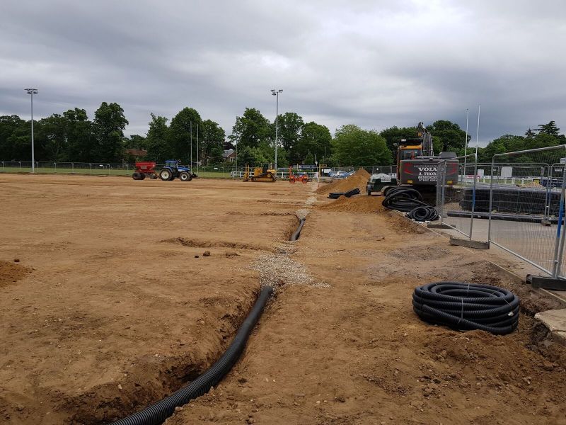 We are four weeks into the project to install an AGP at Fairmile Lane and over 180 lorry loads of soil has been removed from the site. The base of the excavated area has been laser graded and levelled, with the under pitch drainage installed and connected to the new soakaway.