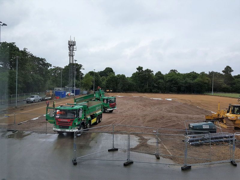 Now the reinstatement begins, with the arrival of ‘type 1’ crushed concrete aggregate laid in rolled and compacted layers on a geotextile (which prevents the aggregate being washed into the soil below). This forms the structural base for the pitch.