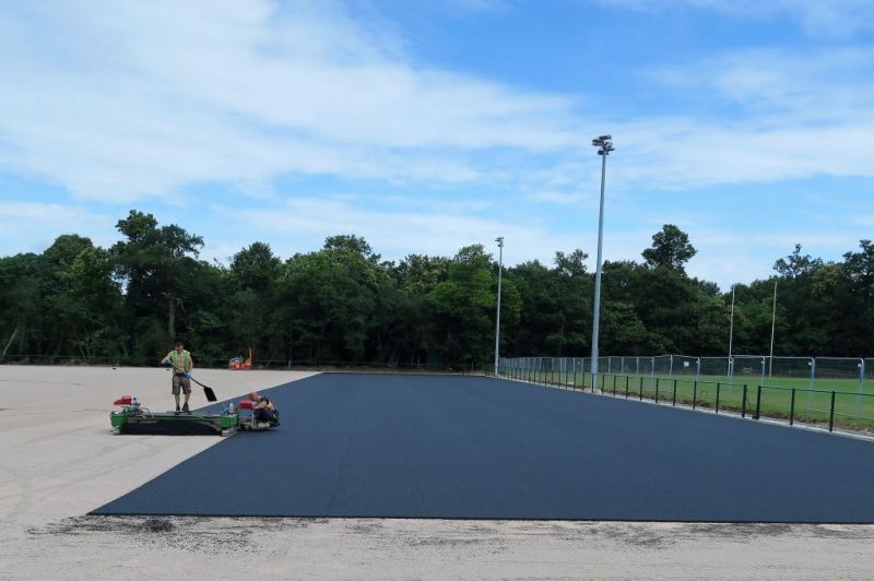 The shock mat is laid in-situ from a small road type surfacing machine and comprises rubber granules mixed with a bonding liquid; this binds the granules together whilst allowing water to permeate through into the drainage system beneath the pitch.