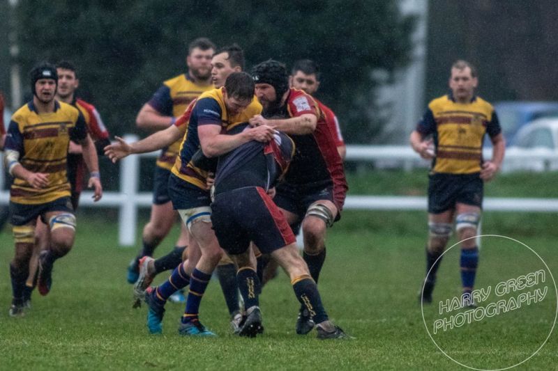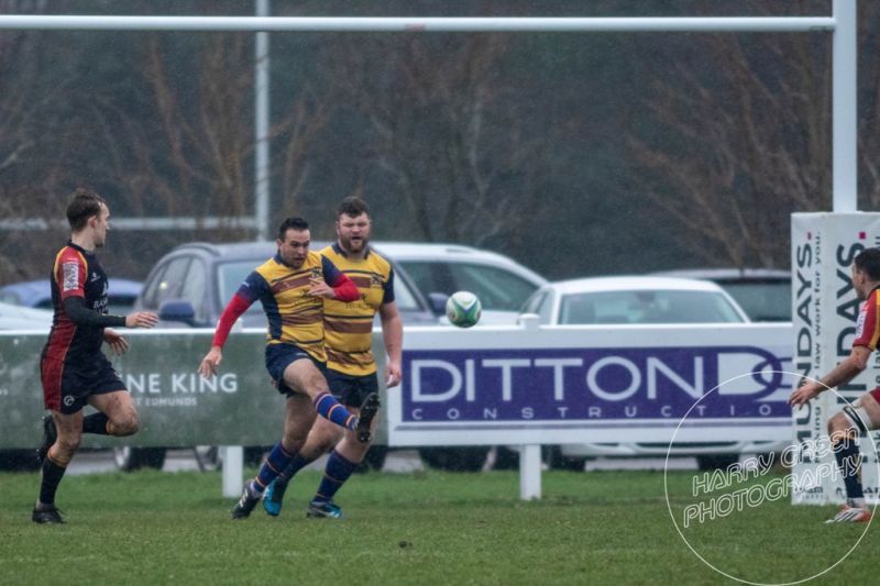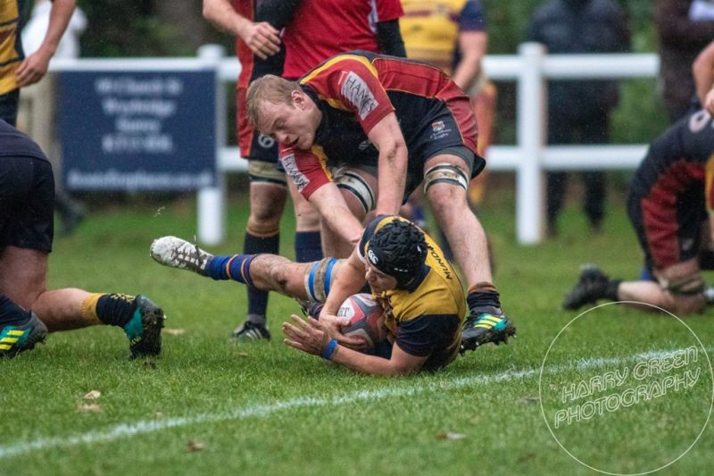 The wet conditions resulted in dropped balls from both sides but after five minutes play stand off Luke Flower kicked ahead winger Will Sanders picked up darted cross field to feed centre Tom Farrelly who in turn kicked to the Chobham try line for Max MacDonald to collect and score 5-0